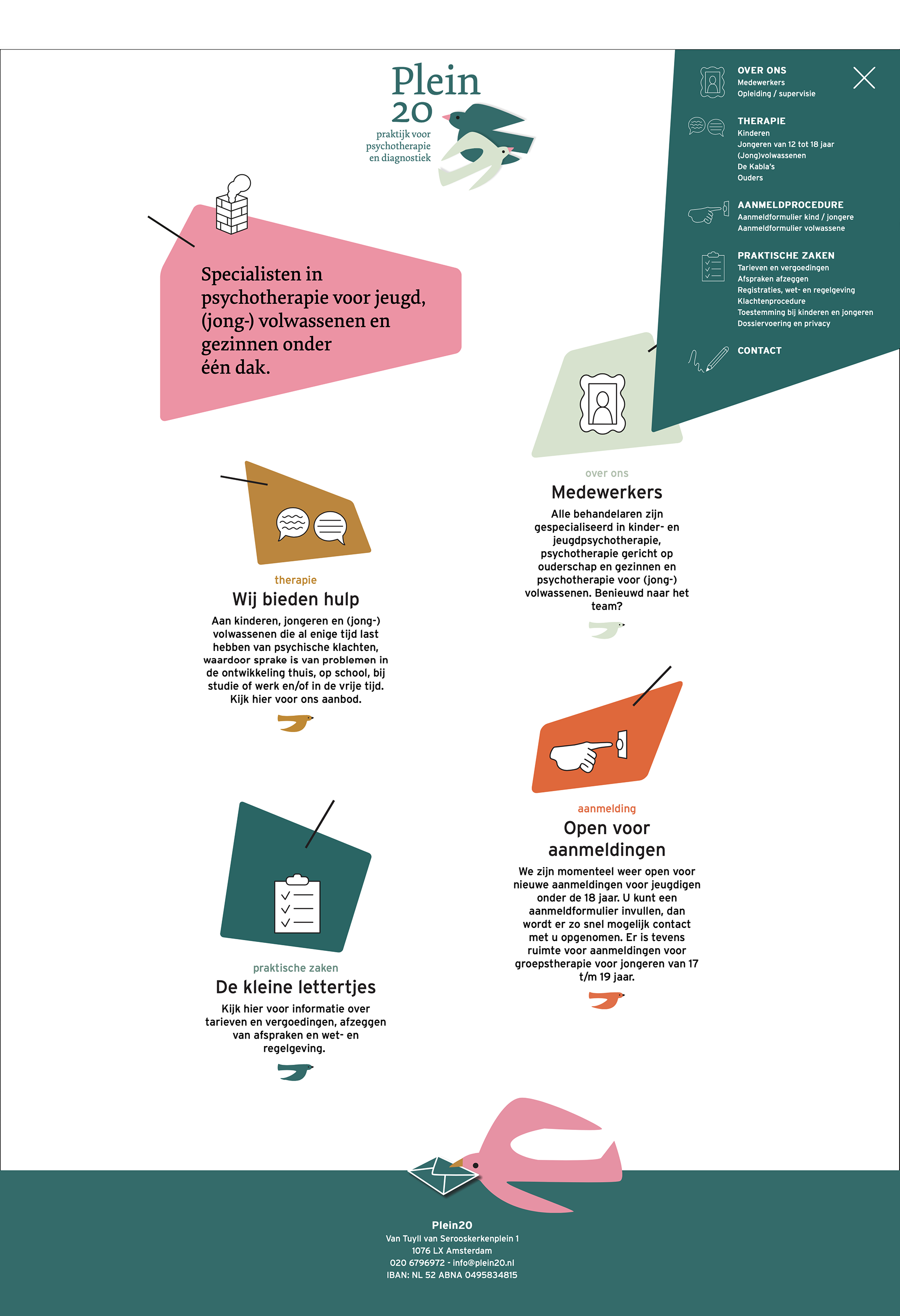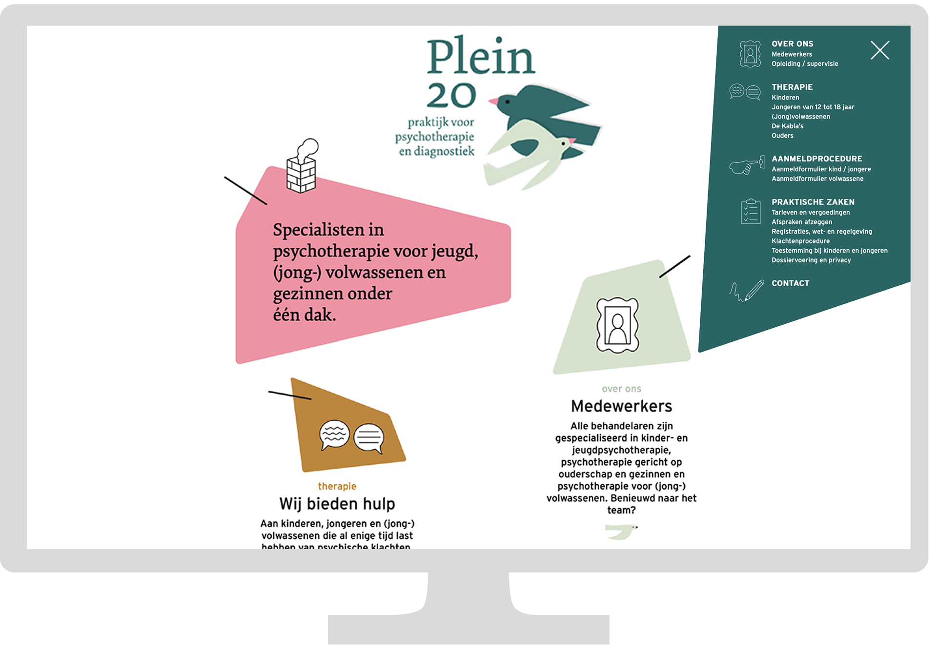Plein 20 is een praktijk voor psychotherapie en diagnostiek. Specialisten in psychotherapie voor jeugd, (jong-) volwassenen en gezinnen onder één dak. Wij ontwikkelden hun huisstijl en website.