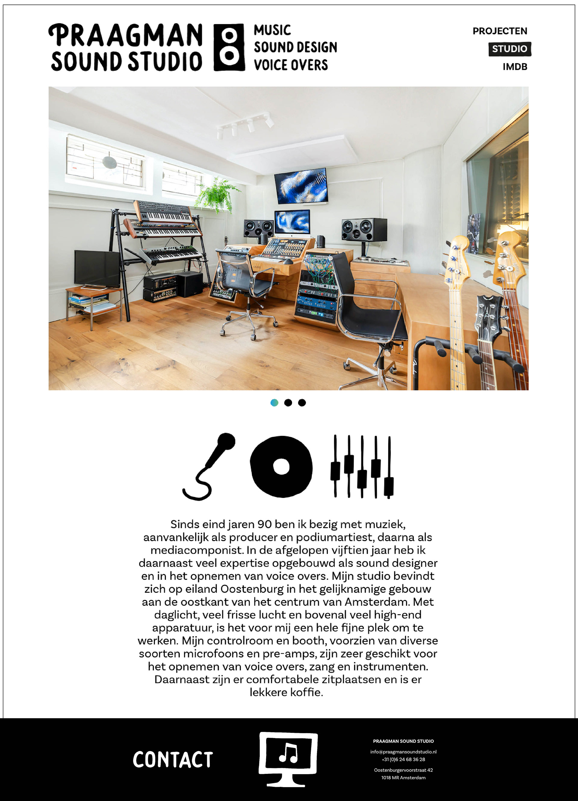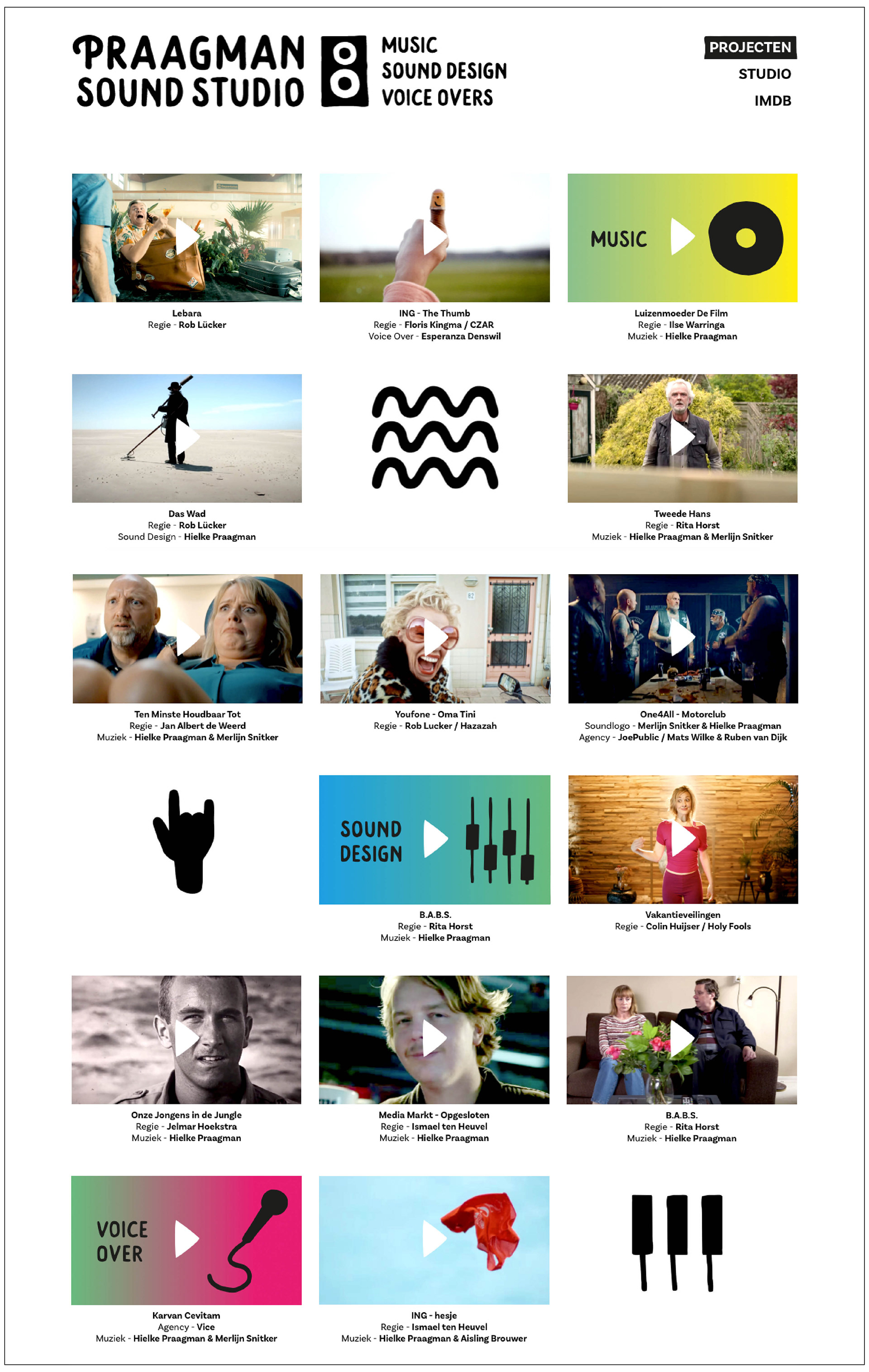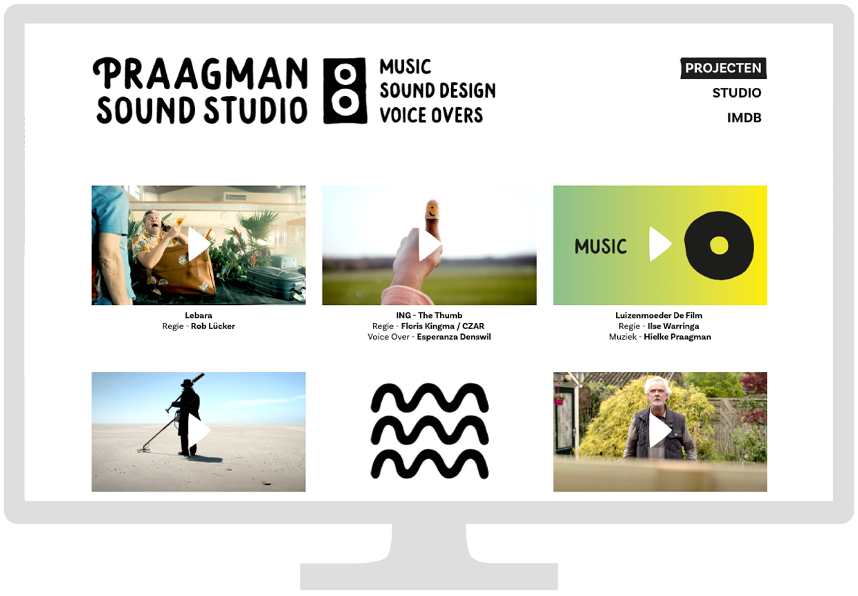 Voor Hielke Praagman ontwikkelden we de visuele identiteit en de website. Praagman Sound Studio maakt sound design, voice overs en music.