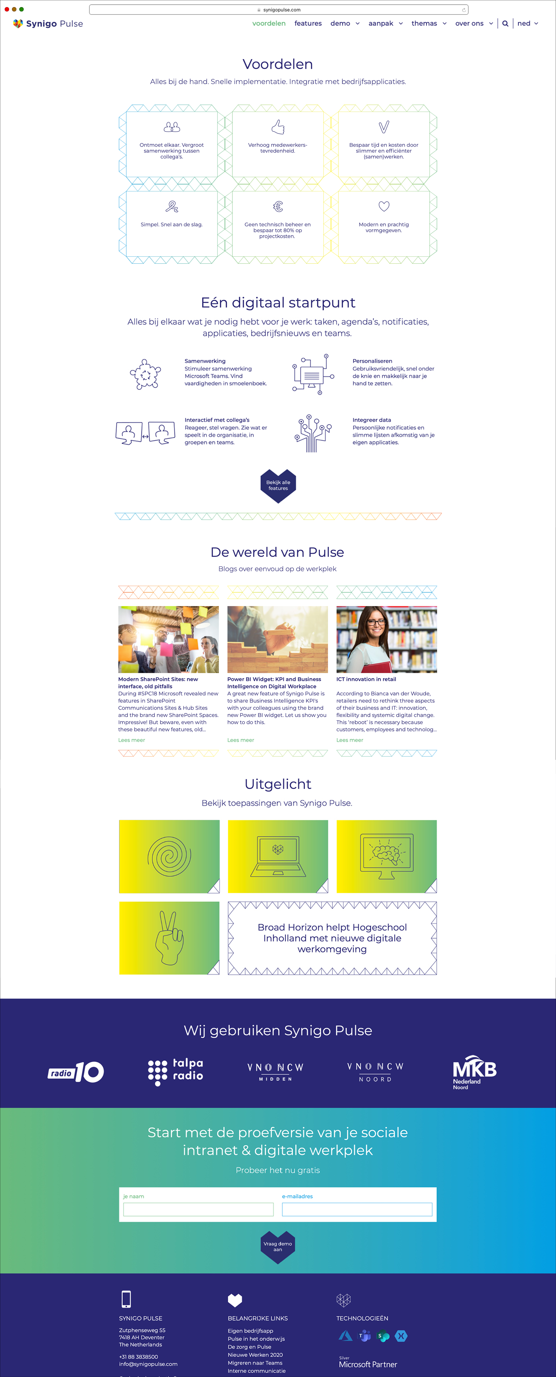 Synigo Pulse biedt bedrijven een platform aan voor een sociaal intranet en een digitale werkplek. Wij ontwikkelden hun site, illustraties, animated gifs en brochure’s.